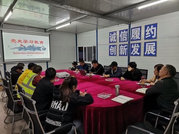 第五分公司黨支部在大竹縣土地灘水庫樞紐及補水工程項目部召開黨史學習教育專題會(2021.03.18)