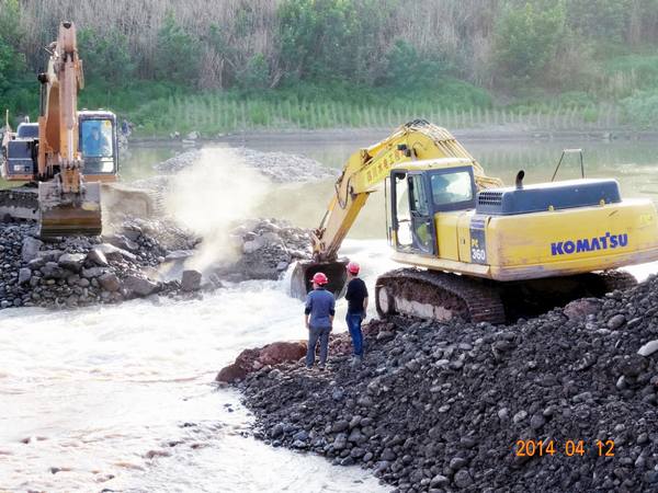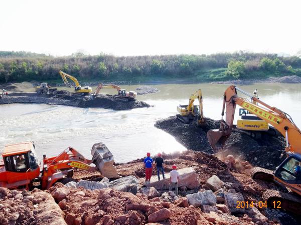 正午時(shí)分,整個(gè)工地機(jī)械轟鳴,6臺(tái)挖掘機(jī)、4臺(tái)裝載機(jī)、6輛20t自卸汽車往來(lái)穿梭,抓緊進(jìn)行圍堰填筑。隨著兩岸戧堤的逐步進(jìn)占,河道由寬變窄,最后形成一個(gè)寬約3米的龍口,往日平靜的涪江現(xiàn)在卻白浪翻滾,咆哮著奔出龍口。由于上游電站泄洪,導(dǎo)致河水水位陡增,用于截流的大塊石瞬間被沖出裹頭,最后3米的龍口始終無(wú)法合龍。面對(duì)前期準(zhǔn)備的截流材料用盡,現(xiàn)場(chǎng)附近又沒(méi)有大塊石材的急情,四處領(lǐng)導(dǎo)果斷采取措施,命令截流施工人員將鋼橋板投入江中用于擋水截流,挖掘機(jī)不斷地向橋板上游投入石料。至晚上8時(shí),二期圍堰終于順利合龍。