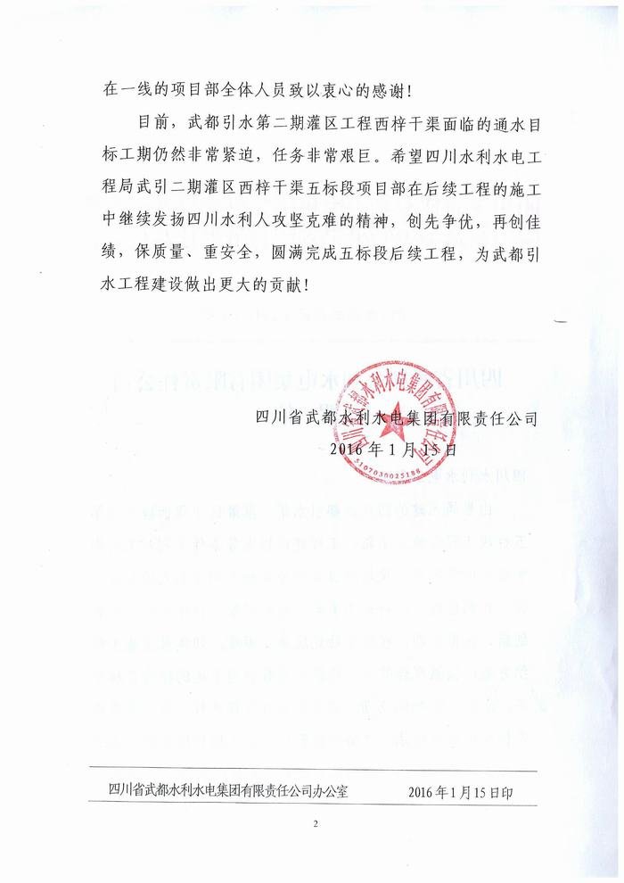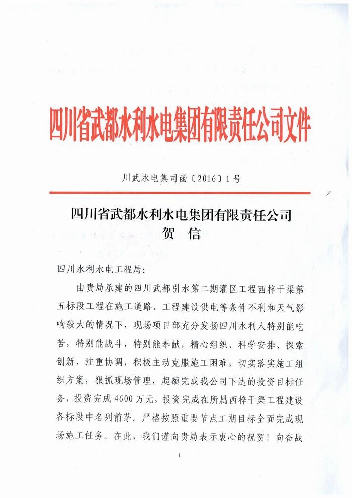 四川省武都水利水電集團(tuán)有限責(zé)任公司致工程局賀信