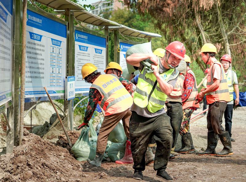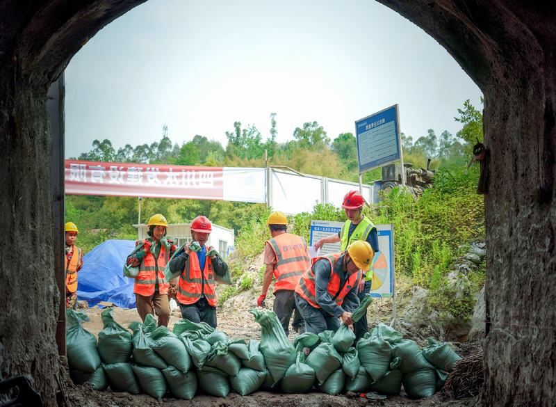 本次演練模擬威遠(yuǎn)縣境內(nèi)遭遇強(qiáng)降雨天氣,降雨量在短時(shí)間急劇上漲,渠道上游來(lái)水即將漫入冒殼山隧洞施工現(xiàn)場(chǎng),面對(duì)這一“突發(fā)狀況”,項(xiàng)目部立即啟動(dòng)應(yīng)急預(yù)案,各小組迅速響應(yīng),分工明確,有條不紊地開(kāi)展搶險(xiǎn)工作。在搶險(xiǎn)過(guò)程中,搶險(xiǎn)人員緊密配合,將裝滿(mǎn)粘土的沙袋依次堆疊,對(duì)隧洞口進(jìn)行封堵;經(jīng)過(guò)爭(zhēng)分奪秒的奮戰(zhàn),隧洞口成功完成搶險(xiǎn)封堵,應(yīng)急處置任務(wù)圓滿(mǎn)結(jié)束。